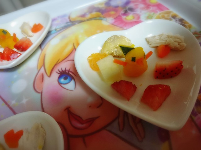 人参、ささみ、いちご、リンゴ、バナナ、みかん、豆乳(無調整)をソースにみたてました(笑